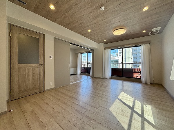 専有面積約69.46㎡の2LDK。新たにリノベーションが施され、洗練された住まいへと一新されました♪北東・南東の角部屋で、たっぷりの自然光と心地よい風が届きます。明るく清潔感のある空間に木の温もりが調和し、穏やかな時間を過ごせそうです。