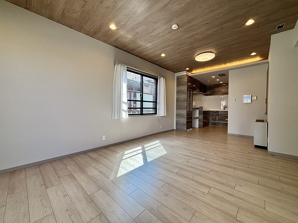 ホワイトとブラウンを基調としたメインルームは、柔らかな温もりが漂う空間❀ 縦長の間取りのためリビングとダイニングのエリアを自然に分けて使うことができ、ご家族や友人との時間を思い思いにお楽しみいただけますよ♩