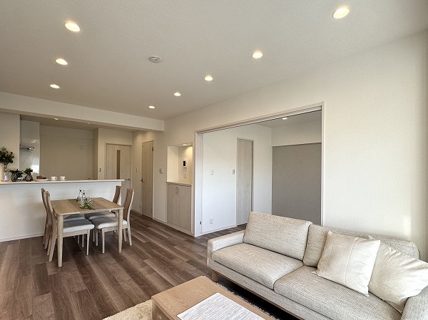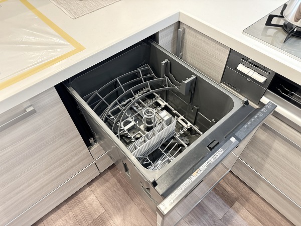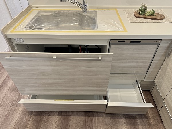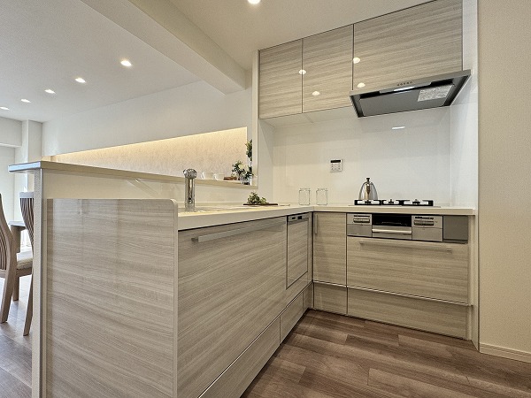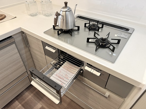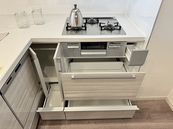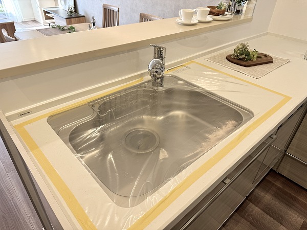 リビングを見渡せるL字型の対面キッチンは、料理をしながら家族と会話ができる快適な動線が魅力。調理スペースと収納の配置も計算されており、作業がスムーズに進みます。ダイニングセット付で食事や団らんの時間をすぐにお楽しみいただけます♥