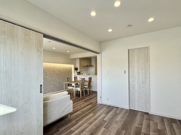 約6.5帖の洋室はリビングと隣接し、スライドドアで仕切ることでフレキシブルに活用可能。朝はドアを開けてリビングとつながる空間として家族との会話や遊びを楽しみ、夜は閉めて落ち着いた書斎や趣味部屋として活用。ライフスタイルに合わせて自在に変化する、居心地の良い空間です。