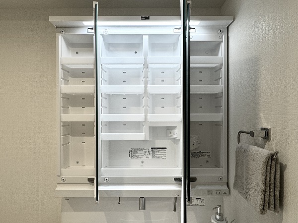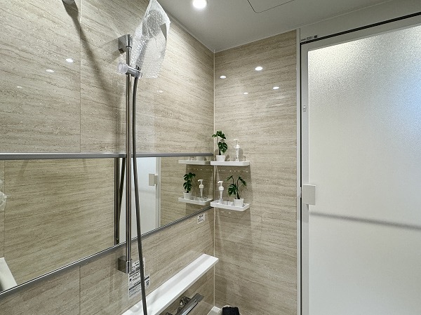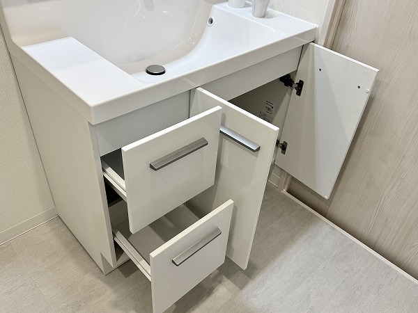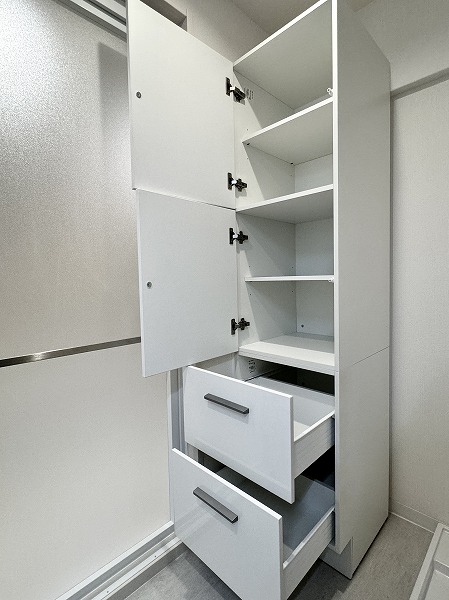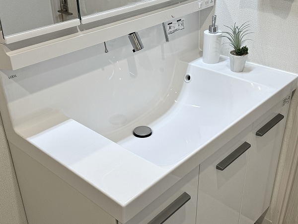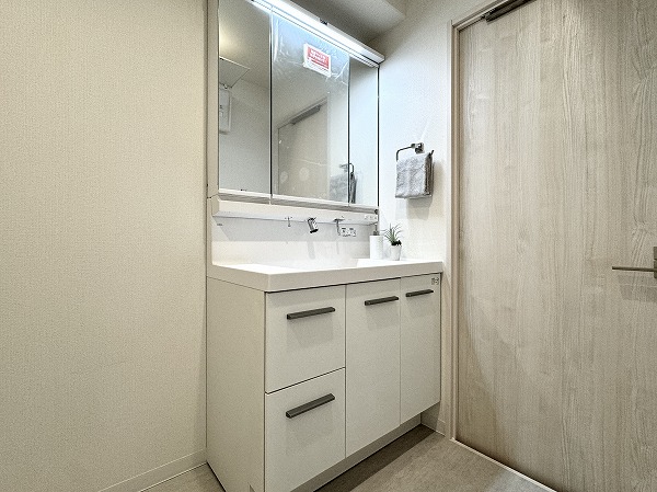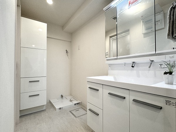 ホワイトを基調としたパウダールームには、洗面化粧台やキャビネット、洗濯機置き場、バスルームが整然と配置され、機能性と美しさを兼ね備えています。リノベーションによって生まれた明るく清潔な空間は、朝の支度や夜のバスタイムが自然と心地よいひと時に・・・✧