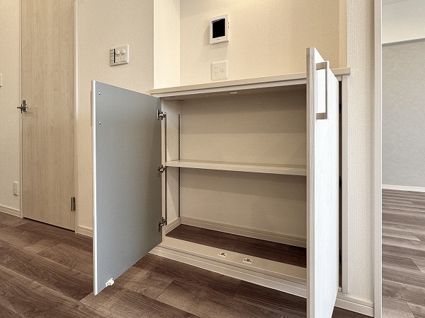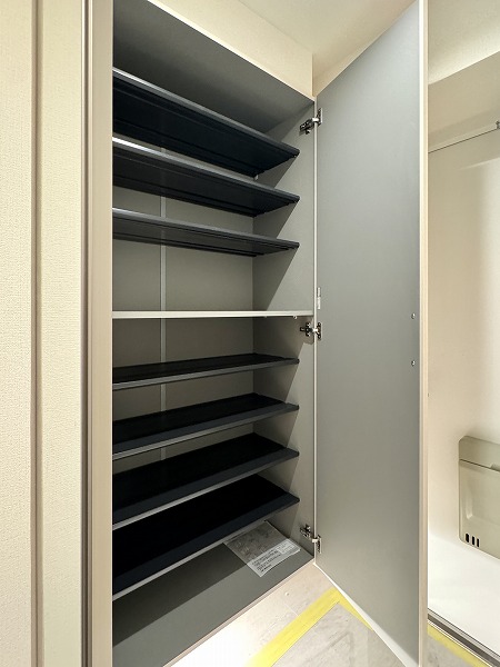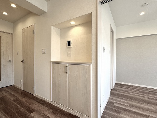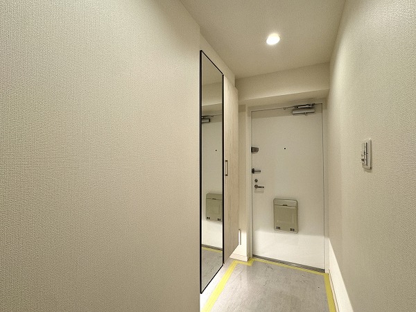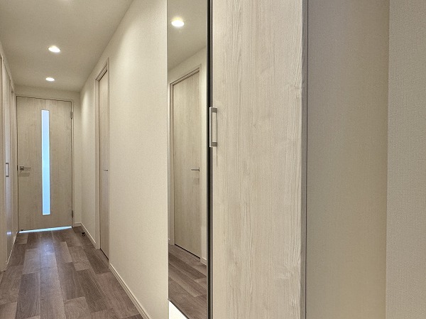 玄関には姿見が備えられ、外出前に全身の身だしなみをしっかりチェック♥シューズボックスも完備され、靴や小物をすっきりと収納できます。帰宅時には片付けもスムーズで、玄関が生活の始まりと終わりを美しく演出してくれますよ。