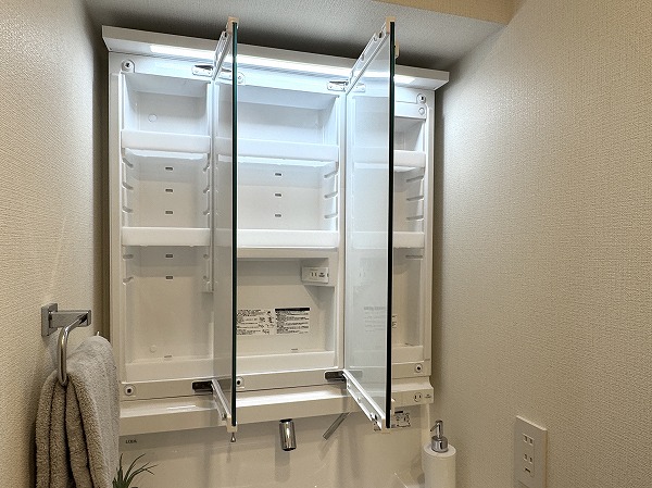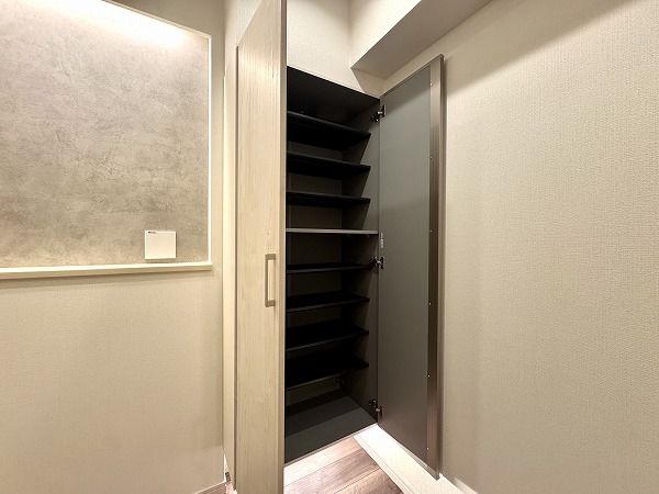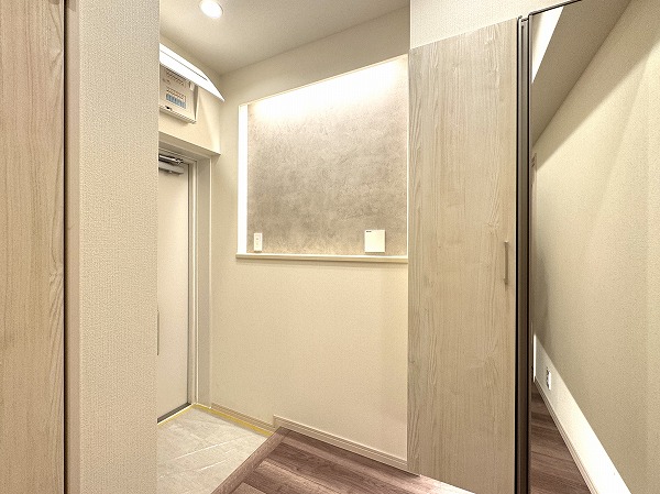 玄関には姿見付きのシューズボックスが備えられ、お出かけ前の身だしなみチェックもスムーズ。さらにニッチが設けられており、照明付きでお気に入りの雑貨を飾れるのもポイント。帰宅時にちょっと気分が上がる、そんな空間に仕上がっていました。