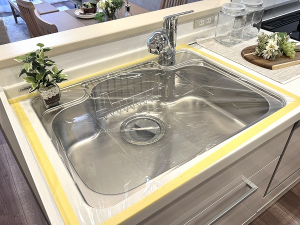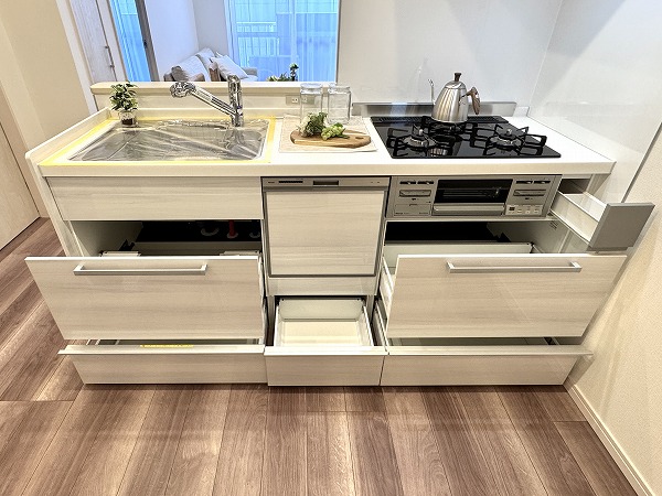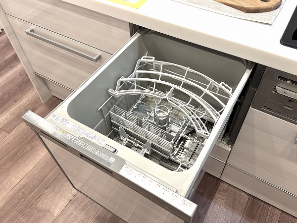 約2.9帖のキッチンは、リビング全体を見渡せる対面式を採用。調理をしながらご家族やゲストとの会話を楽しめる開放感のある設計です。配膳や片付けもしやすく、家事動線がスムーズなのも魅力的。さらに食洗機を完備しており、忙しい日々の後片付けをしっかりサポートしてくれます。
