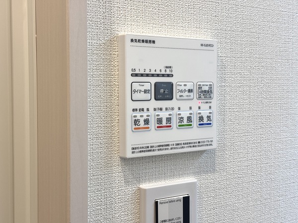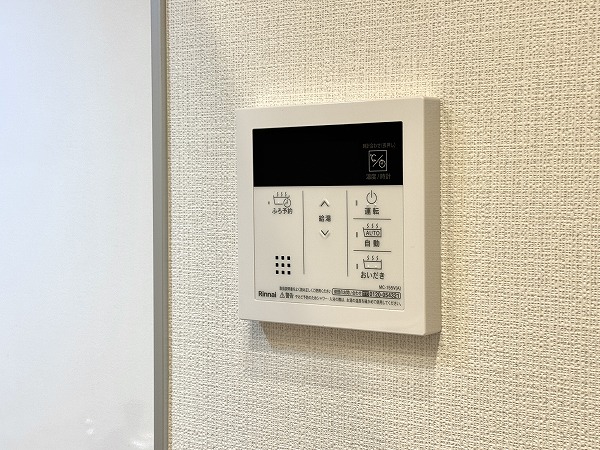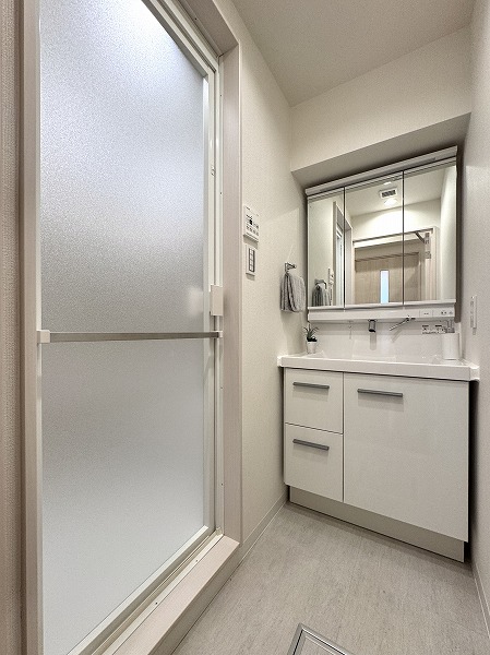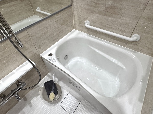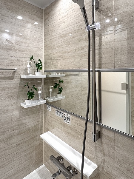 木目調パネルが優しい印象を与えるバスルーム。大きなミラーが空間を広く見せ、毎日の疲れを癒すのにぴったりの雰囲気です。シャワーの高さ調整ができるスライドバーや、追い焚き機能付きバスタブなど、使い勝手にもきちんと配慮されていますよ。