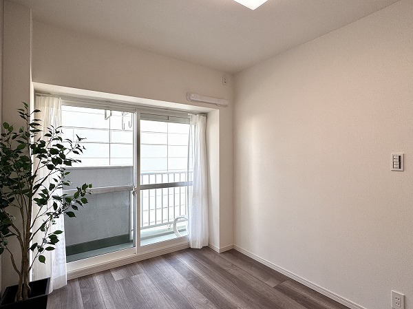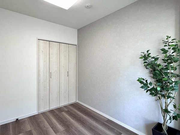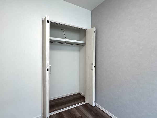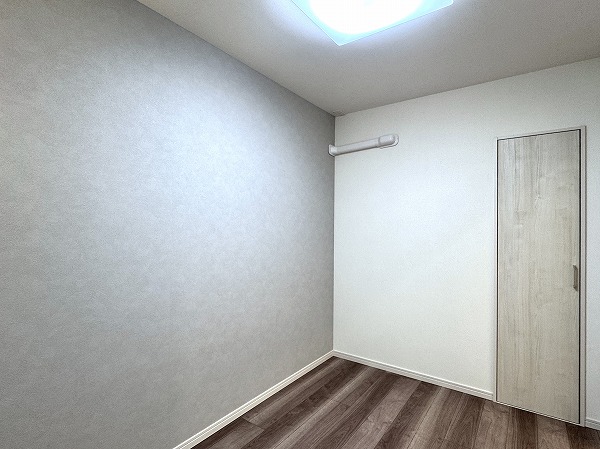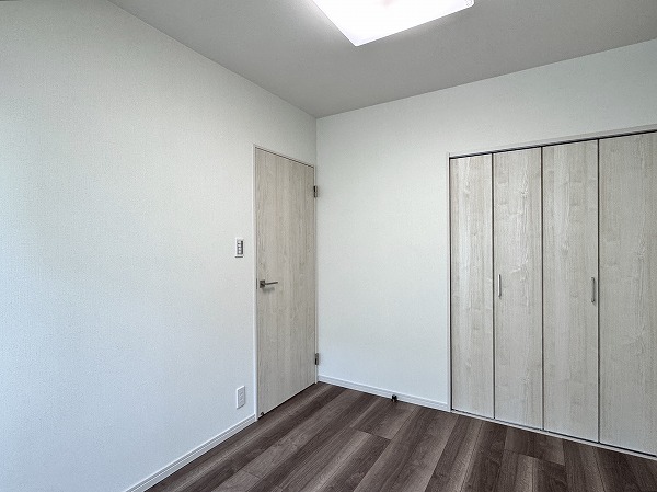 約5.0帖の洋室は大きめのベッドを置いても余裕のある広さ。シンプルな内装デザインのため、家具のテイストを選ばず自由なコーディネートが楽しめます。さらに大容量のクローゼットを備えており、衣類や荷物をしっかり収納できる点も魅力。