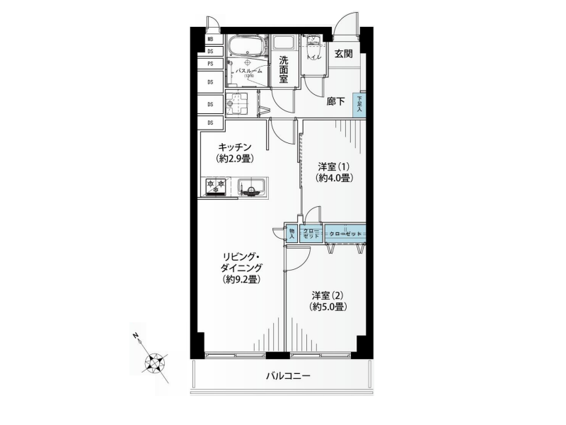 メインのリビングダイニングは約9.2帖。縦長のレイアウトにより、ダイニングスペースとリラックススペースを自然にゾーニングできる設計です。南西向きの掃き出し窓からは明るい陽光がたっぷりと差し込み、開放感のある空間に。