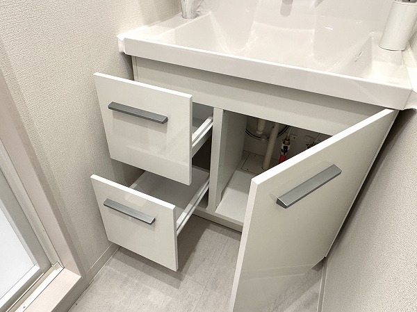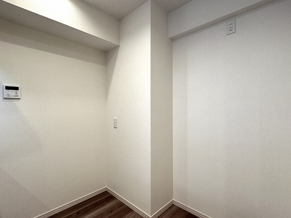洗濯機置き場には扉が付いており、来客時にもすっきりとした印象をキープできます。音が響きにくいのも安心ですね。上部棚には洗剤やストック類を置いておけるので、使い勝手も良好◎