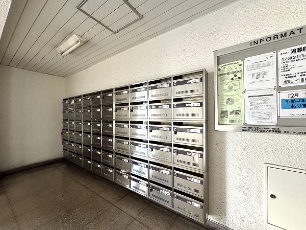 エントランス内に足を踏み入れると、開放感のある空間が広がります。管理人室が設けられており、日々の暮らしに安心感を与えてくれる存在。掲示板にはマンション内のお知らせが分かりやすく掲示されており、帰宅時にさっと確認できる点も実用的です。