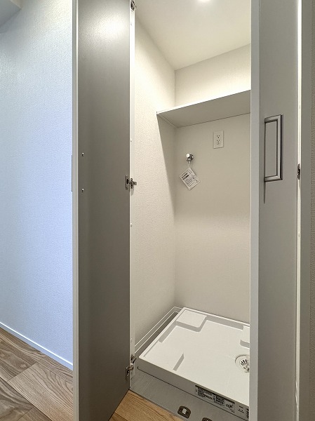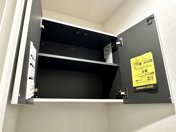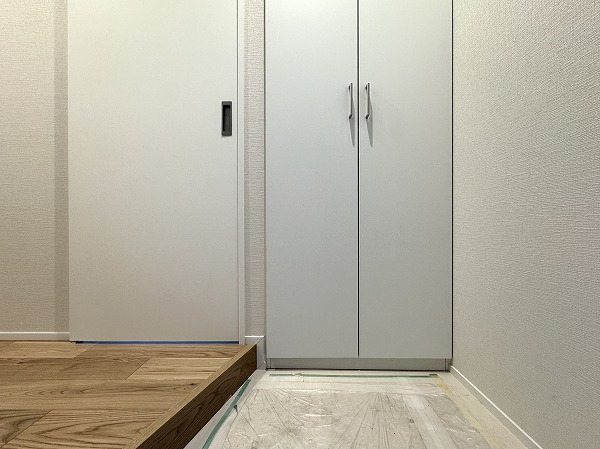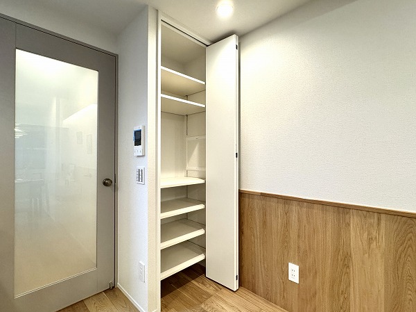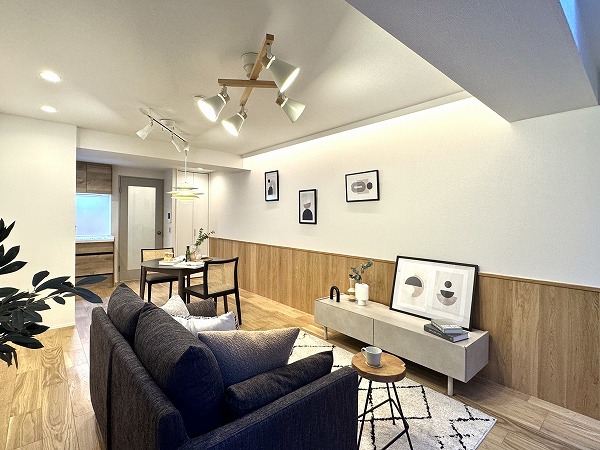 お部屋は1階部分の1LDK。専有面積は52㎡超と、ゆったりとした1人~2人暮らしを送ることができるスペースを確保。木目調の腰壁が印象的なメインルームはおよそ17.4帖の広々とした空間に。扉付きの収納が豊富に取り入れられ、生活感が出やすい物をまとめて収めることで、空間をすっきり保ちやすい設計となっています。リビング&リビングスペースは長方形のレイアウトとなっており家具の配置もしやすいのではないでしょうか。