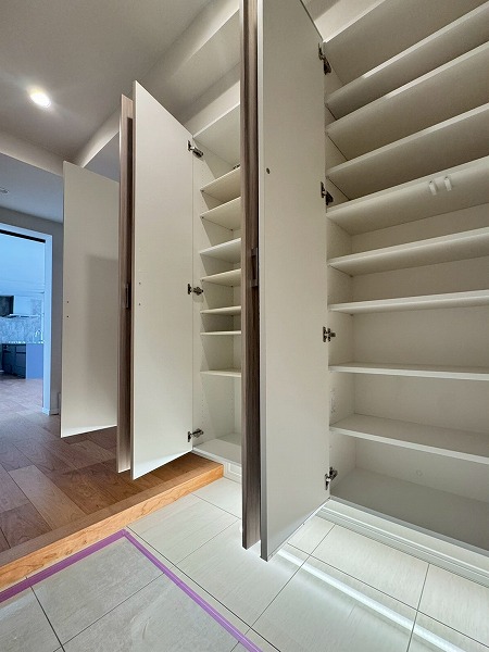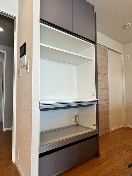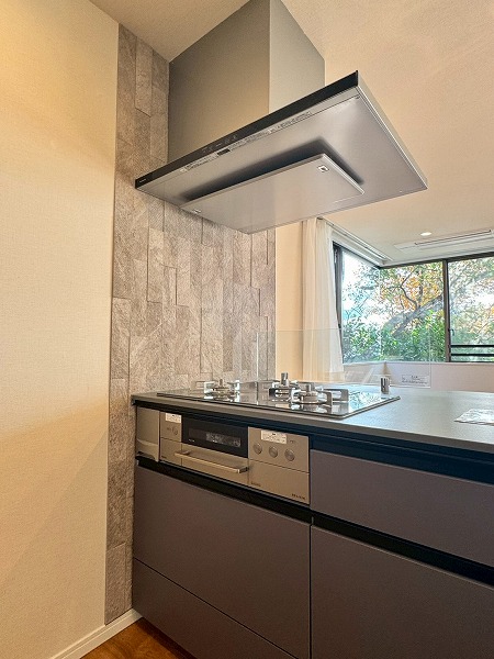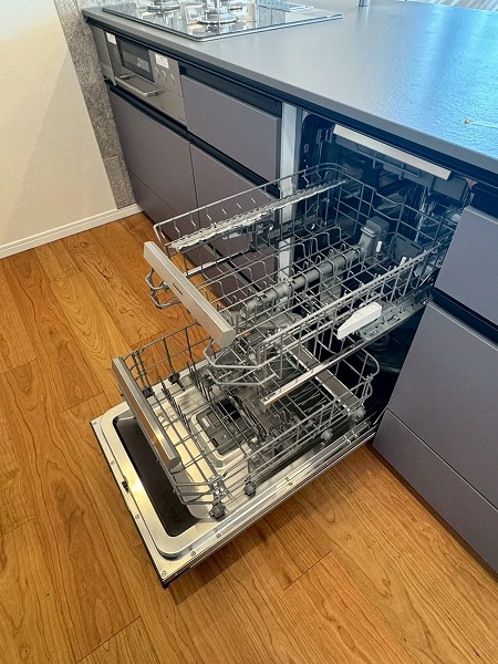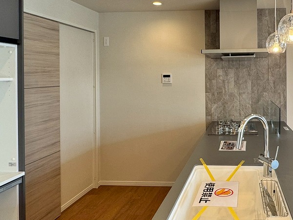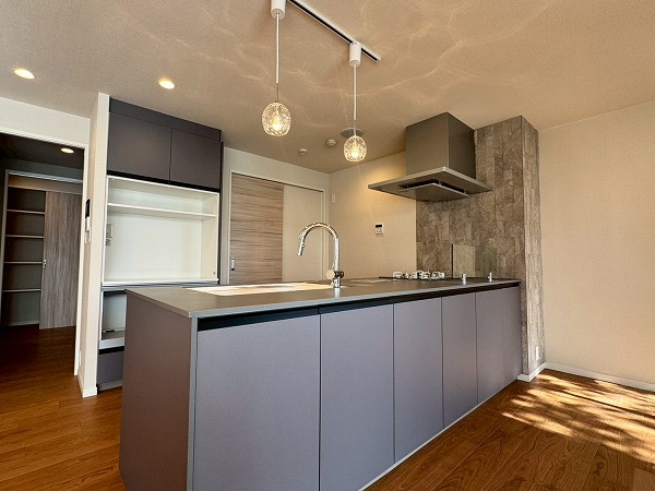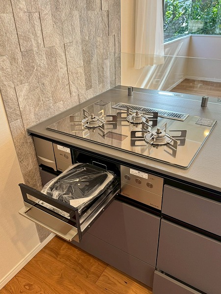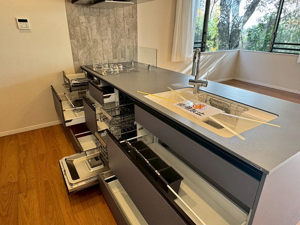 リビング全体を見渡せるオープンキッチンは、家族の気配を感じながら料理ができる安心感が魅力。浄水器付き水栓やグリル付きコンロ、食洗機など、日々の家事を支える設備も充実しています。収納力にも優れており、生活感を抑えた美しいキッチン空間を保てますよ✧