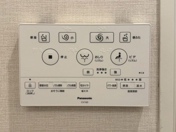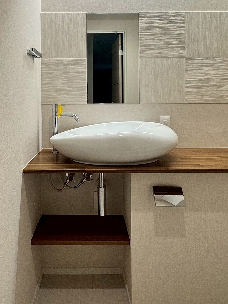 トイレはシンプルながら清潔感のある仕上がり。温水洗浄付き便座に加え、丸みを帯びた洗面ボウルの手洗いカウンターを備えています。来客時にも使いやすく、細やかな配慮が感じられる空間ですね。