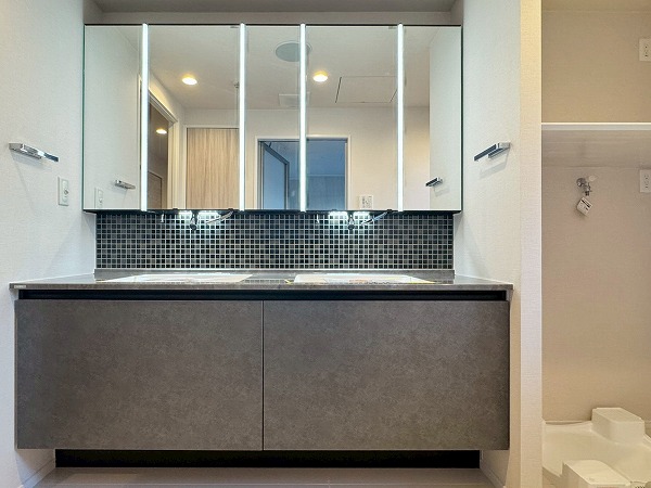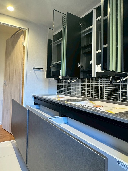 家族が並んで使える2ボウル洗面化粧台は、忙しい朝の心強い味方。ブラックテイストのデザインが空間に大人っぽさを添えています。細かなアイテムまで収まる収納のおかげで、洗面室が散らかりにくいのも魅力。