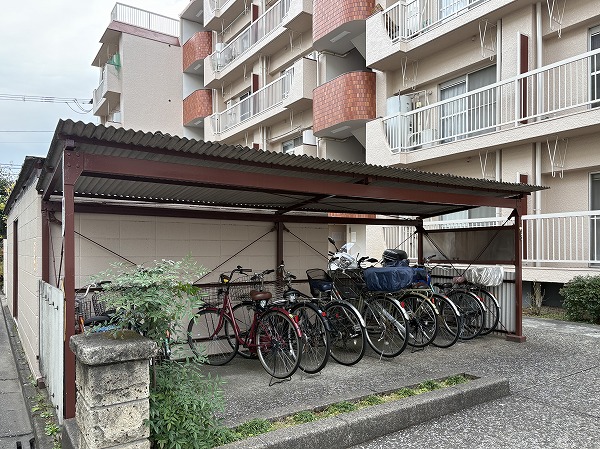 エントランス左手には駐輪場とバイク置き場がありました。一部雨ざらしとなっているため、雨で濡らしたくないという方はカバー必須です◎