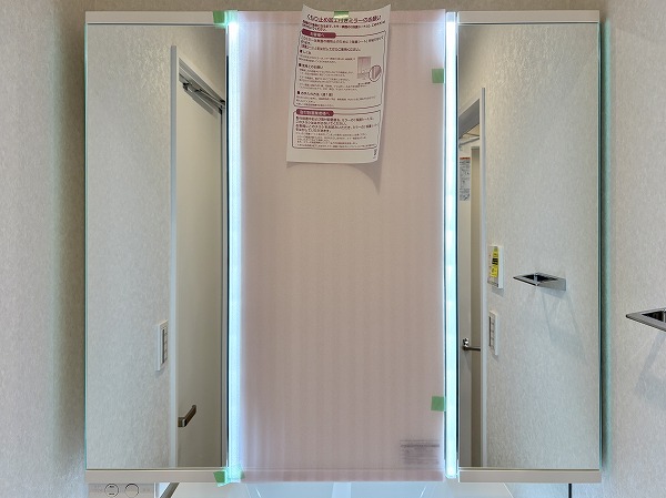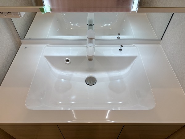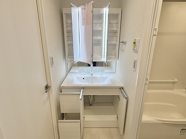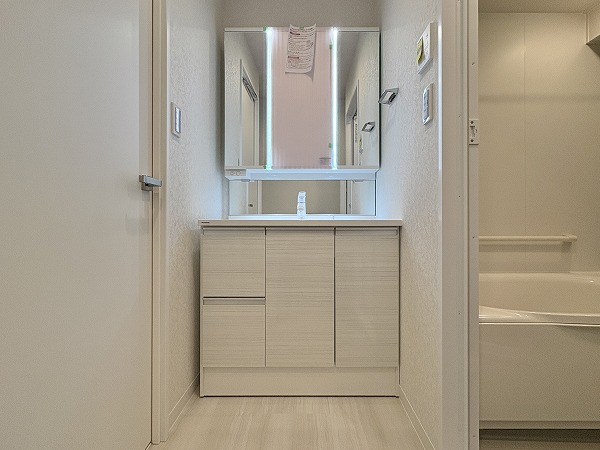 パウダールームはこちら。柔らかい光でリラックスタイムを演出するバスルームと、お化粧や身だしなみチェックの際に役立つツインラインLEDを備えた洗面化粧台がありました。スタイリッシュさだけでなく、機能面も申し分ないパウダールームです!