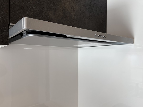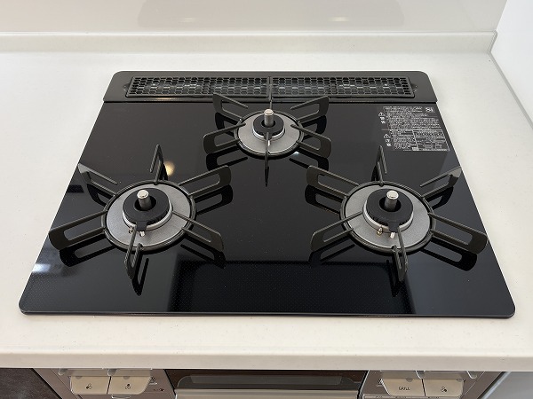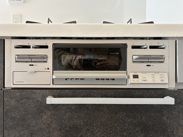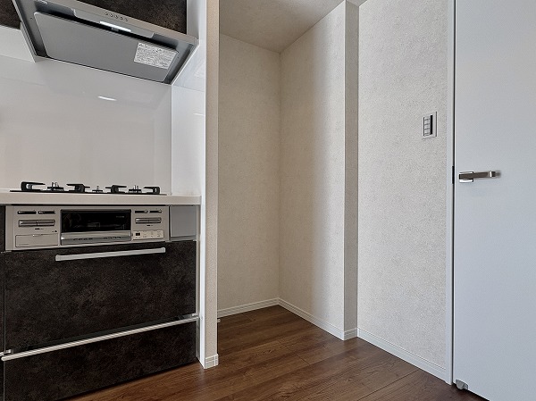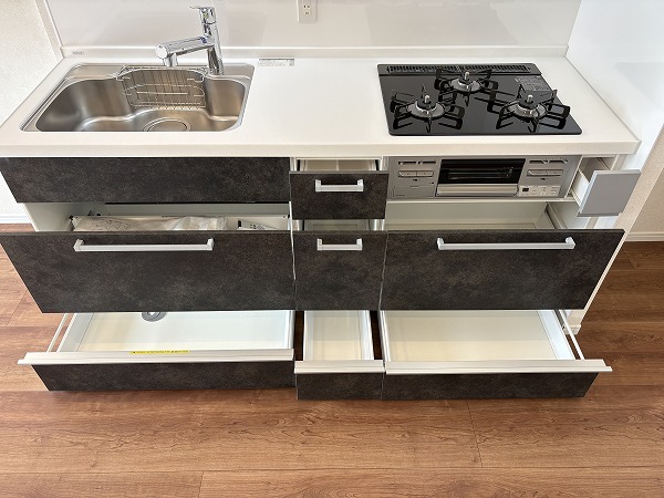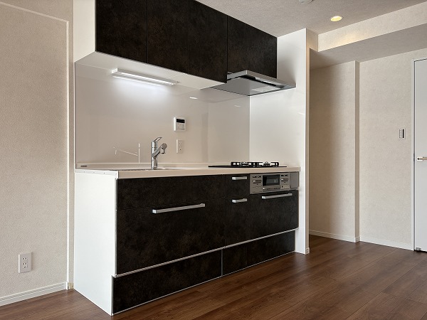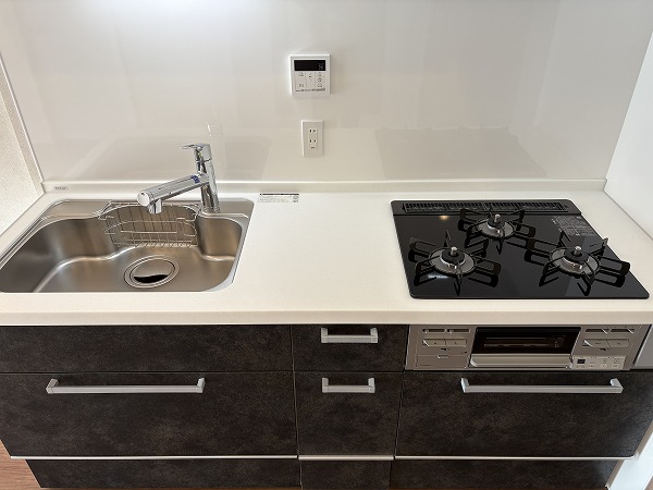 キッチンはざらざらとした質感の黒でシックなデザイン。コンパクトながら、調理スペースと収納は十分に設けられておりました。LDKがシームレスなので、ご家族や友人と一緒に料理する際も楽しく行えそうですね♩