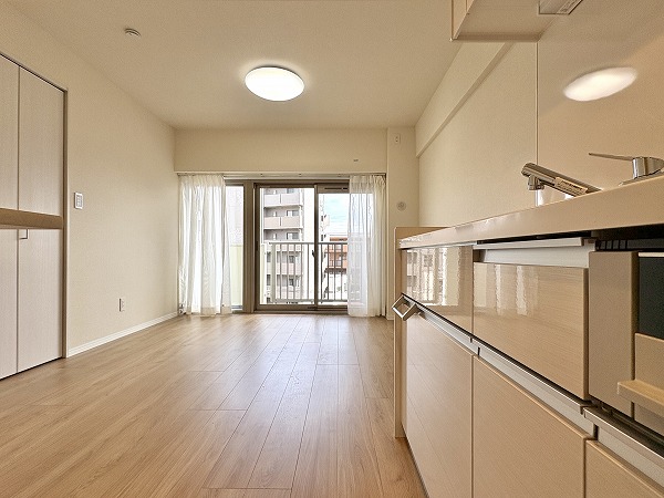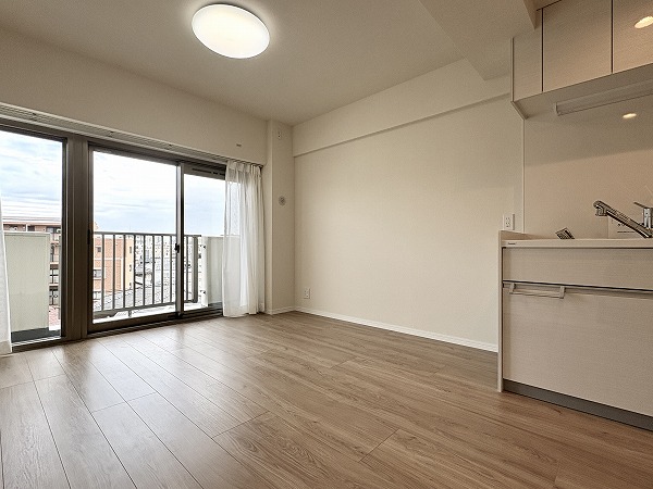 LDKは約8.8帖の縦長空間。ホワイトのクロスとウッド調のフローリングとの組み合わせがナチュラルな雰囲気で、北欧家具との相性が良さそうなお部屋◎窓はバルコニーに直結いていて、窓を開ければ新鮮な空気を室内に取り入れることができますよ♪