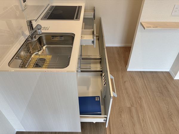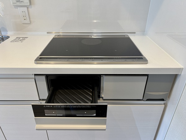 キッチンはウォール型で、リビングダイニングと距離が近く配膳やお片付けの動線が良いです。揚げ物などの調理の際にレンジフードで吸収しきれなかった臭いは、リビングの掃き出し窓を開ければ解決!こぢんまりしていますが、パワフルなキッチンです。