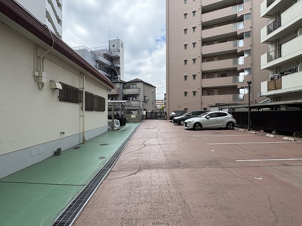 エントランス左側の通路を進むと、駐車場・駐輪場が広々と設けられていました。駐車場は雨ざらしなので、雨風をしのぎたい方はカバーをつけてください!