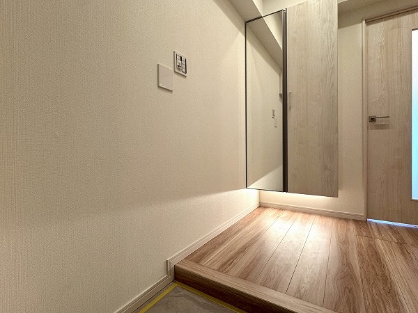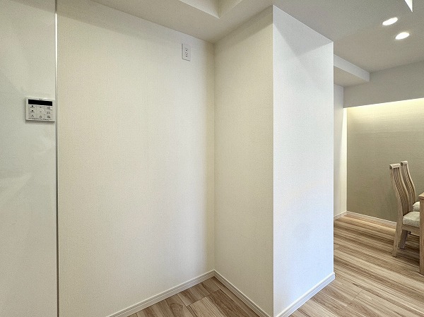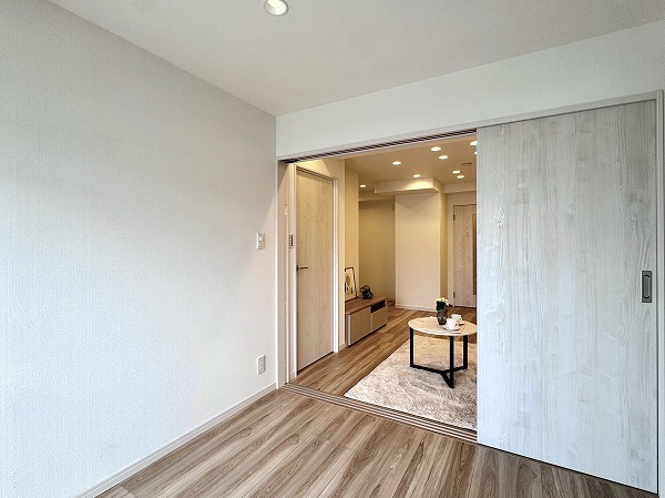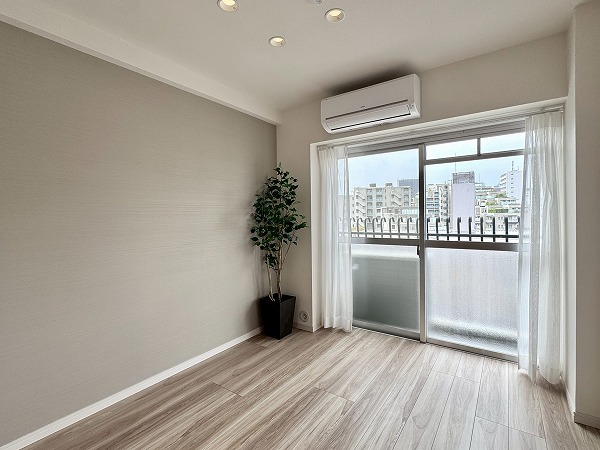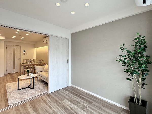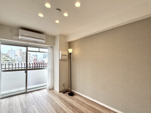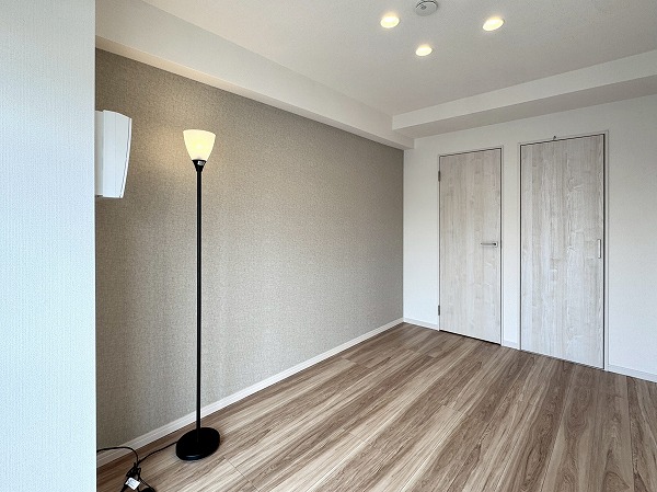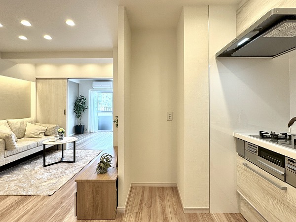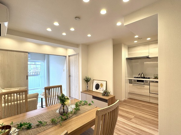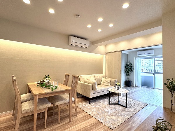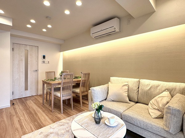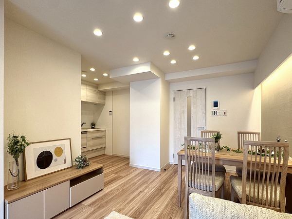 ご紹介したのは8階部分の2LDK、専有面積47.50㎡の1~2人での暮らしにピッタリのお部屋です。内装は新規リノベーションによって整えられ、ヴィンテージマンションでありながらまるで新築のような感覚でお住まいいただけるのではないでしょうか。淡いトーンのフローリングと、ライトグレーのアクセントクロス、バランス良く取り入れられた間接照明など、ナチュラルながら上品な印象の空間設計が素敵でした。