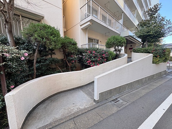 大通りから少し入ったところにアプローチがあります。白いタイルに青々しい植栽が映えますね✧階段だけではなくスロープもついているため、車椅子やベビーカーをご利用の方も簡単に出入りが可能✧