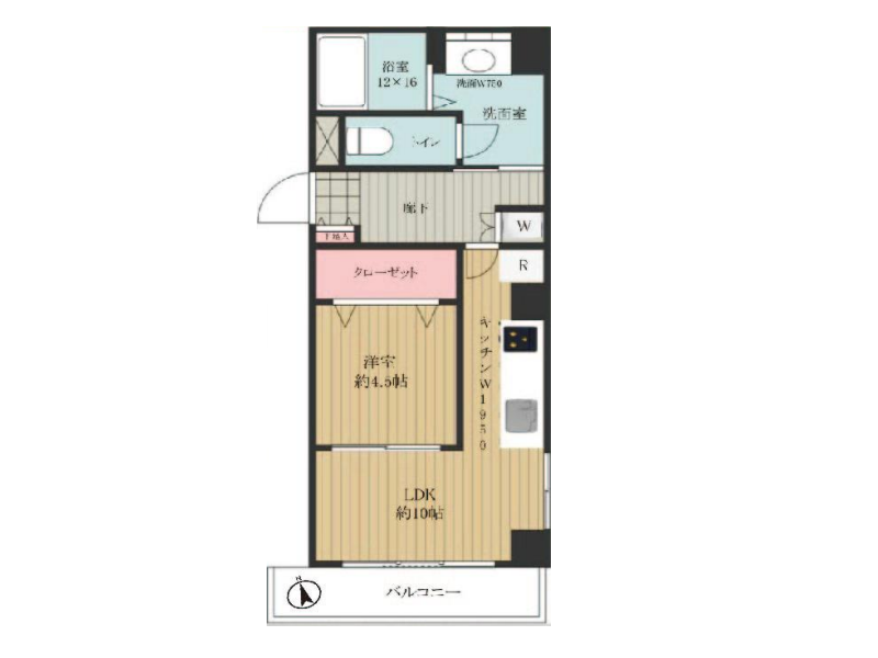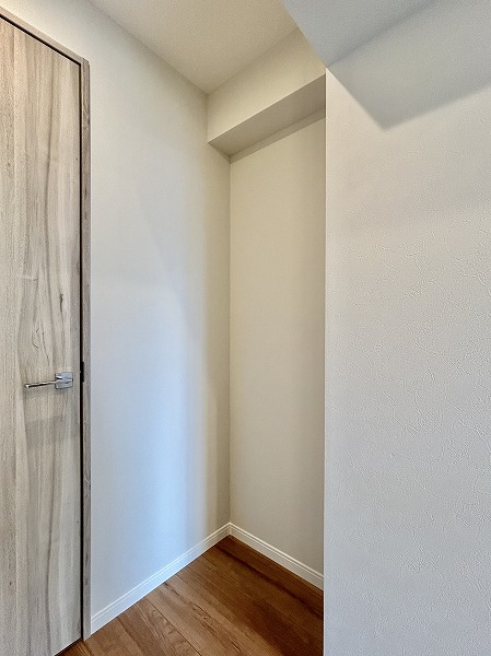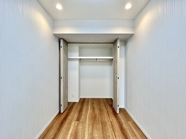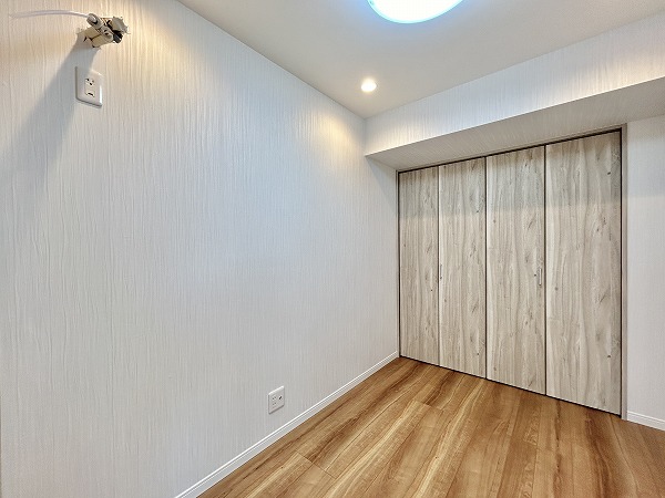 約4.5帖の洋室は、光沢のあるホワイトクロスが空間を明るく見せます。少々コンパクトなお部屋ですが、ローベッドを設置すれば圧迫感を抑えられそう◎収納力のある上吊りクローゼットはお洋服や小物をすっきり収納可能です。