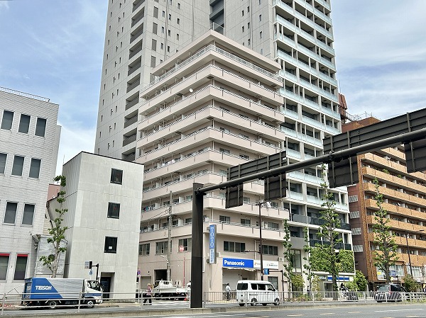 淡いベビーピンクの外観が控えめに存在感を放つ『五反田永谷タウンプラザ』。地下1階付きの地上11階建てマンションで、総戸数は34戸。1階には建材店「㈱タケウチ」が入っており、飲食店ではないため匂いや煙の心配もほとんどありません。