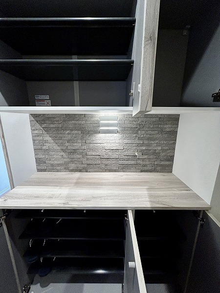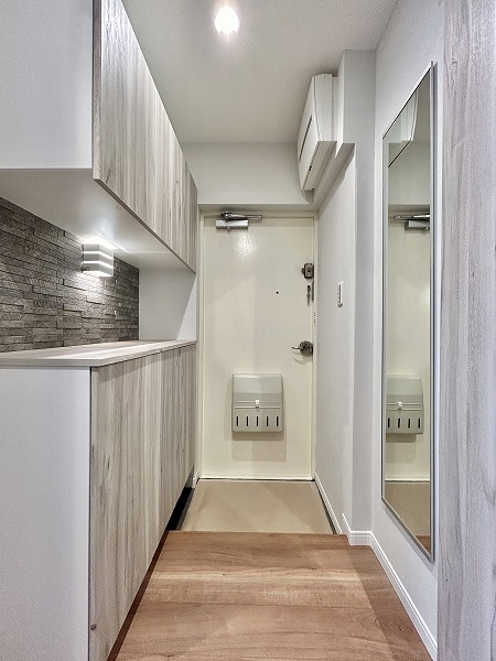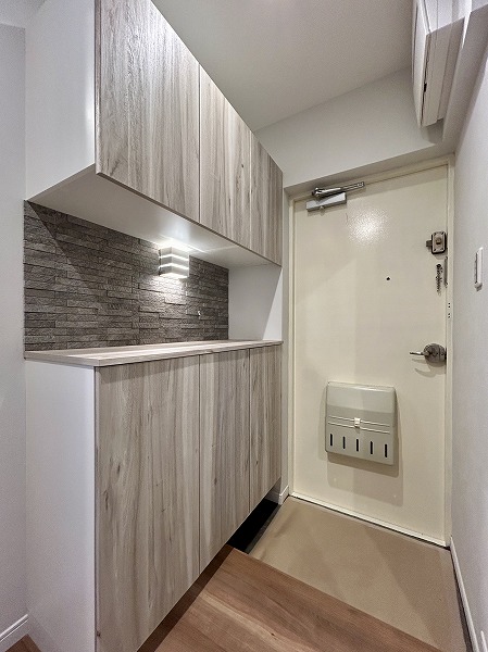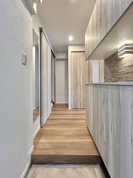 落ち着いたベージュやブラウン、ホワイトで統一された玄関。壁面タイルとセパレートタイプのシューズボックスが上品に調和。正方形のライトがさりげないアクセントを添え、コート掛けやミラーの配置で機能性も確保されています。