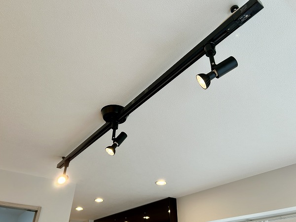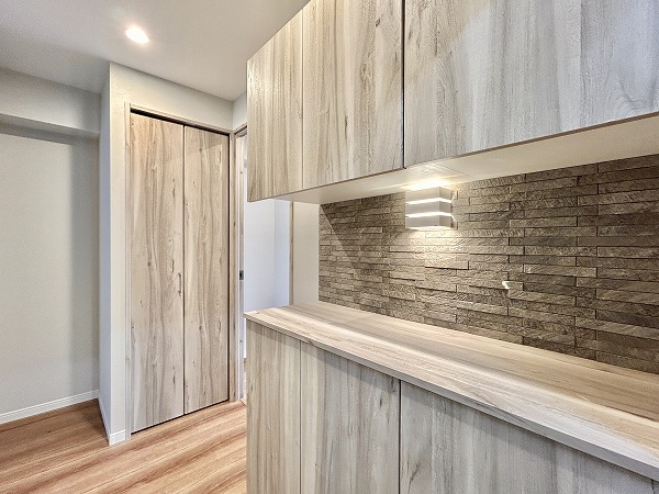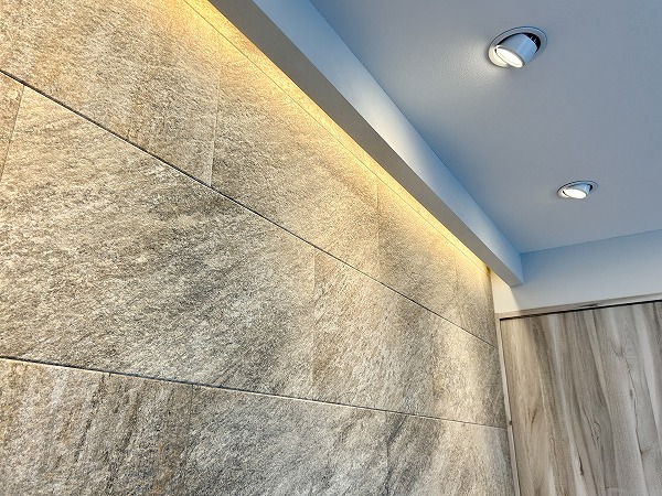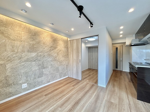 約10.0帖のリビングダイニングキッチンはL字型で、くつろぎ空間を広めに使える造り。壁面のタイル調アクセントクロスが空間を引き締め、コーニス照明やスポットライトがインテリアを美しく照らします。大きめのアートや壁掛けテレビも映える洗練された空間です。
