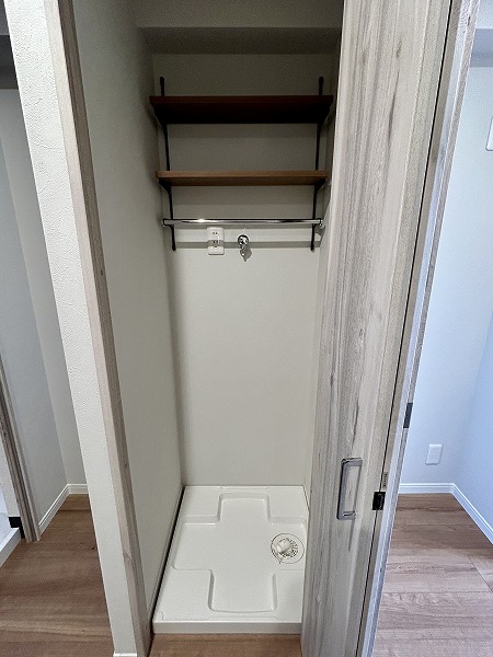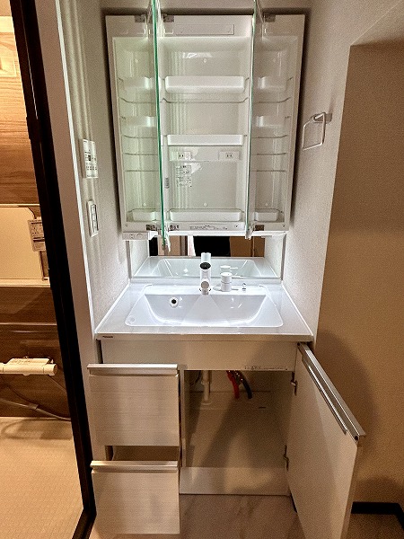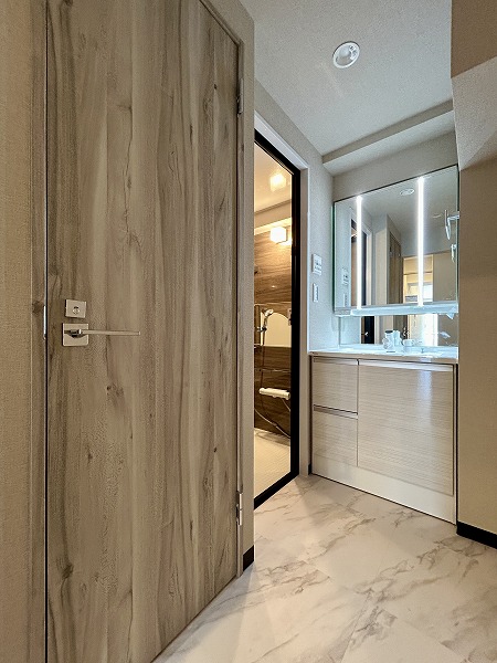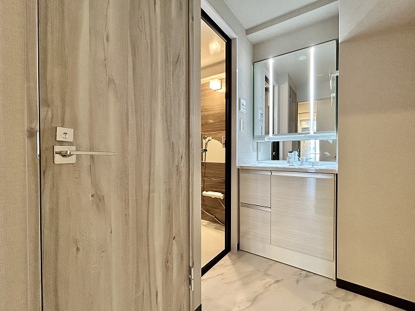 洗面化粧台・脱衣スペース・バスルームがまとまったパウダールーム。縦型LEDライト付き3面鏡が快適な身支度をサポートしてくれます。洗濯機置き場は廊下に独立しており、折れ戸で目隠し可能。水回りの動線もスムーズですね。