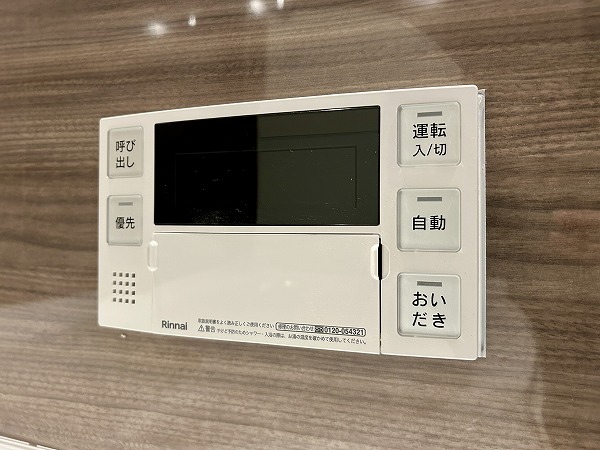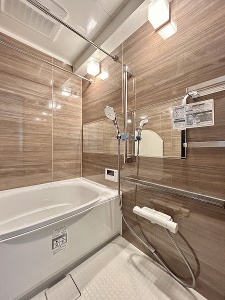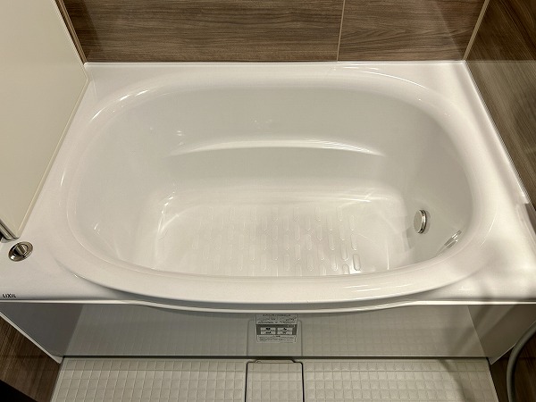 ブラウンの光沢パネルが落ち着いた印象を与えるバスルーム。1216サイズで1人暮らしにちょうど良い広さです。丸型バスタブが体にフィットし、オートバスや追い焚き機能で快適にリラックスできます。