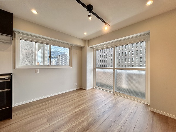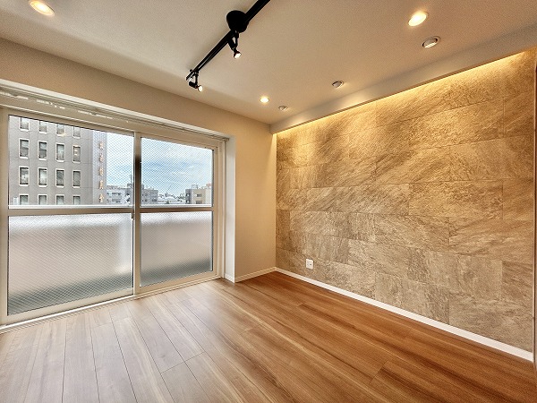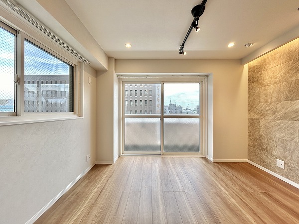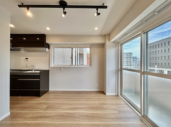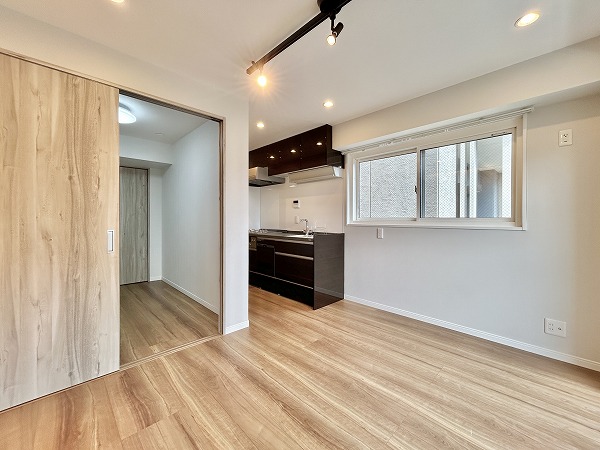 広めの開口部から光が降り注ぐ1LDK。南向きバルコニーに面した窓からは開放感あふれる採光が得られ、高層階のため外からの視線も気になりません。メインルームと洋室はスライドドアで仕切れており、開放すればワンルーム感覚で利用可能。水回りの配置もメリハリがあり、リノベーションされた内装はアクセントクロスや間接照明、玄関タイルなど細部にまでこだわりぬかれていました♪また、目黒川沿いの散歩コースも近く、都会暮らしと自然を両立できます。お洒落エリアで快適な新生活をスタートしたい方にぴったりの住まいですよ。 ライター:hana【25J14】