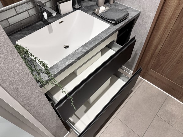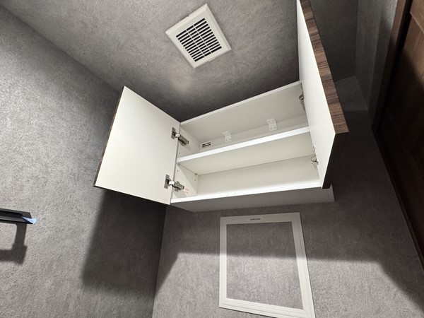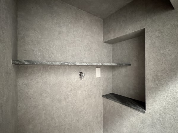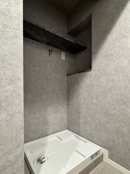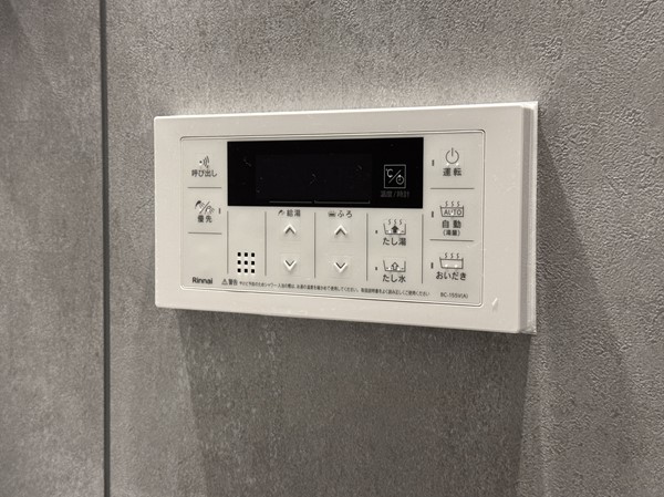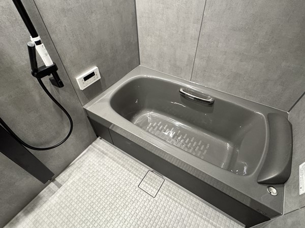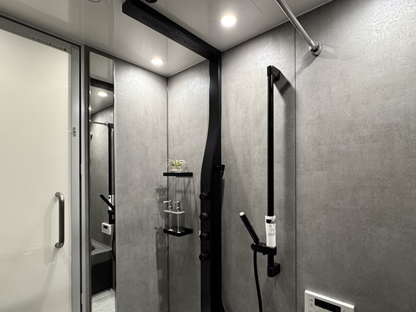 マットグレー×ブラックの組み合わせが高級感を醸し出すバスルーム内には、ホテルライクなオーバーヘッドシャワーを設置。打たせ湯機能が搭載され、日々の疲れをピンポイントで癒してくれます。たっぷりのお湯に身体を沈めたら、ヘッドレストに頭を預け、極上のバスタイムをお楽しみください。