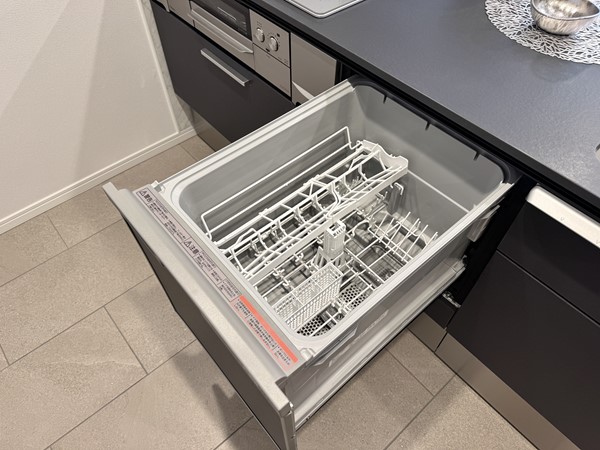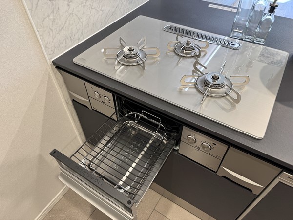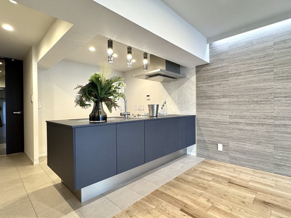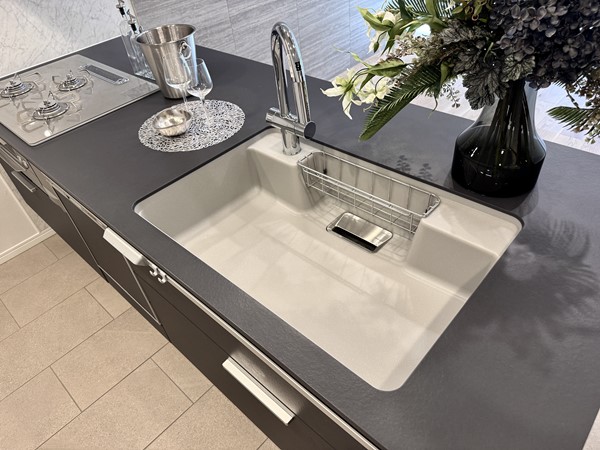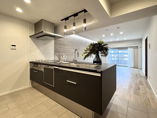 ブラックがひときわ目を引くキッチンは、グリル付き3口コンロと食洗機を搭載。対面側にも食器の収納がついており、お食事中に出番の多い小皿などの収納にぴったりです。床にリビングダイニングとは異なるタイルを使用することで、広い空間の中でも調理スペースを上手にゾーニングしています。