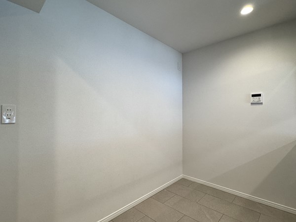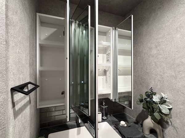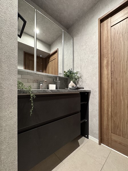 水回りが1つにまとまったパウダールームは、余裕を持たせた造りが魅力。洗濯物用のバスケットを置いても圧迫感がなく、朝の混み合う時間帯もストレスフリーにお使いいただけます。大きなミラーが特徴の洗面化粧台にはレンガ調と石調の組み合わせが使用され、デザイン性も忘れません。