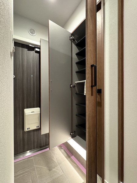 落ち着いた木目のシューズボックスは家族みんなのシューズを余裕でしまっておける収納力が強み。レジャーシート・お掃除のグッズなど、生活空間に持ち込むのは少し抵抗感がある物もこちらにしまっておけそうです。全身ミラーでコーディネートは足元まで完璧に✧