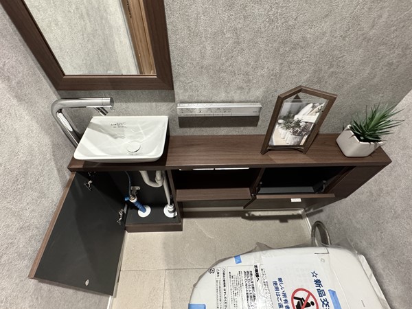 トイレスペースにはタンクレストイレを採用し、スタイリッシュなイメージに仕上がっています。洗面カウンターでは、すぐに手を洗うことができ衛生的です。鏡は空間を広く見せる効果があるほか、来客時のゲストにも喜ばれる存在。