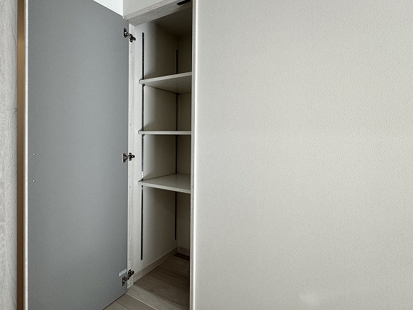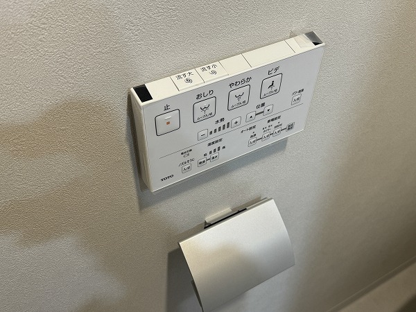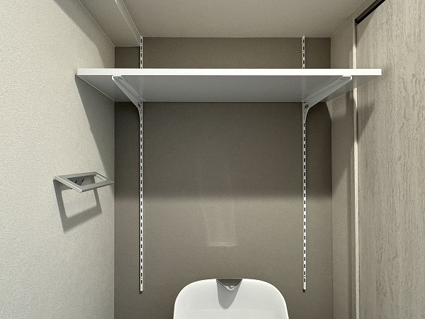 トイレは温水洗浄機能付きで、寒い季節でも快適な使い心地。背面上部には収納ラックが設けられており、トイレットペーパーのストックなどを手の届く位置に置けます。ラックは可動式のため、使いやすい高さに調整できるのも嬉しいポイント。