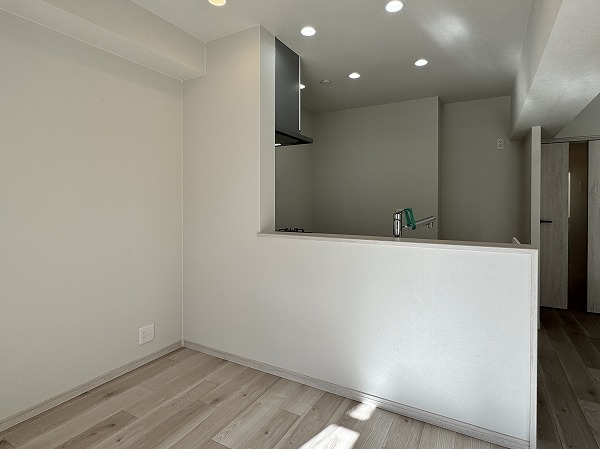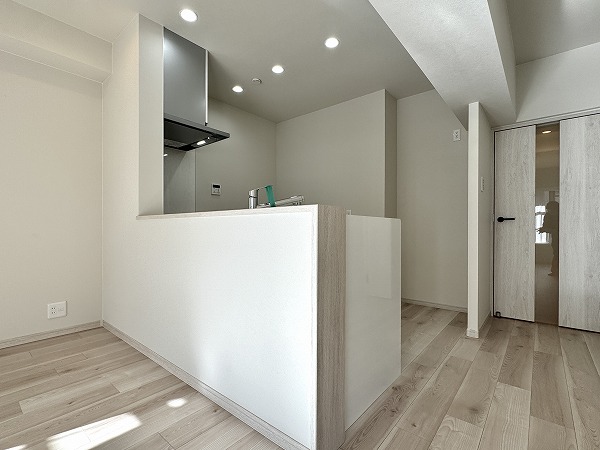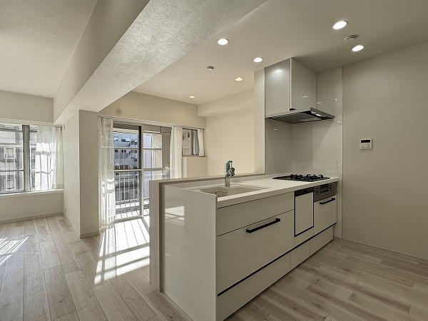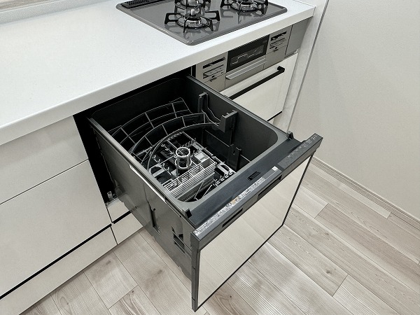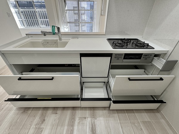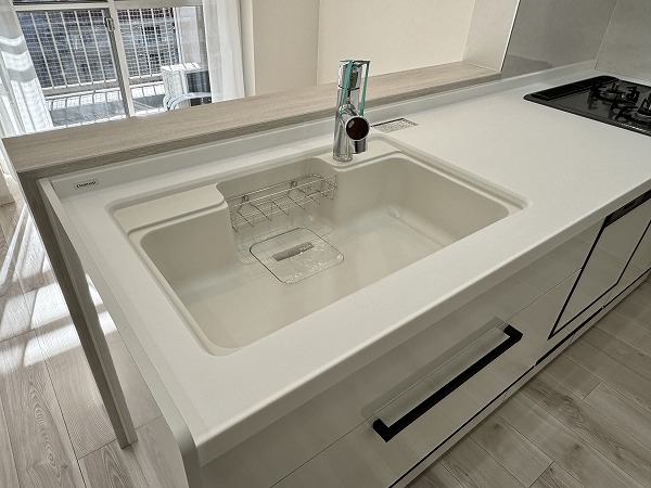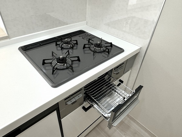 キッチンはリビング全体を見渡せる対面タイプ。調理をしながら自然と会話が生まれ、家族やパートナーとの距離が近づきます。収納スペースも豊富で、調理器具や調味料をたっぷりと収められる設計。グリル付きコンロや食洗機、広めのシンクなど日々のお料理を快適にしてくれる設備が整っていますよ◎