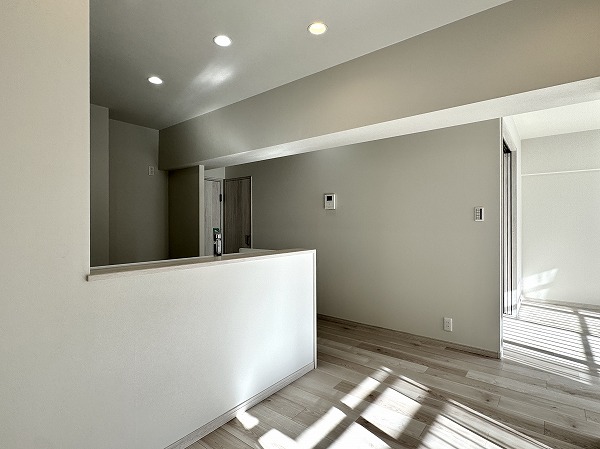 メインルームは約15.8帖の広さ。特徴的な形状を活かし、リビングとダイニングを自然に分けられるレイアウトです。動線が整理しやすく家具配置に悩みにくい点も魅力。内装はシンプルにまとめられているため、北欧テイストからモダンまでどんなインテリアとも相性が良く、自分らしい空間作りを楽しめそう♪