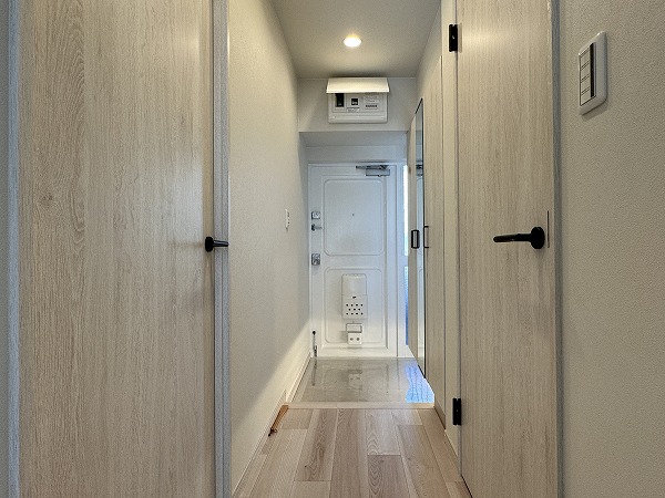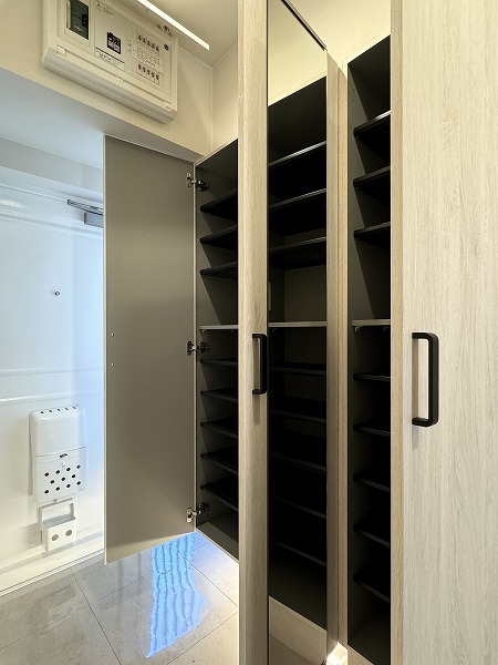 玄関は柔らかな木目調が印象的な、落ち着いた空間に。トールタイプのシューズボックスを備えており、靴をたっぷり収納できるため、玄関周りはいつでも整った印象を保てます。扉には全身鏡が設けられており、外出前の身だしなみチェックもスムーズ。