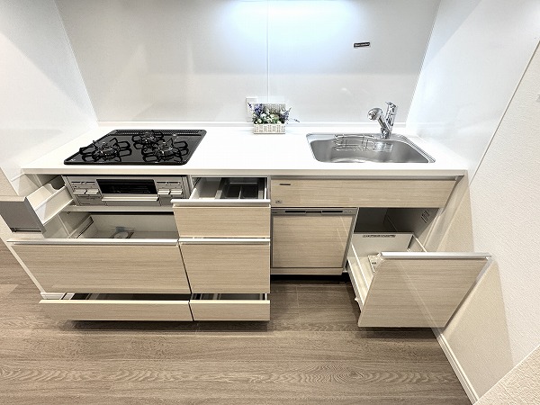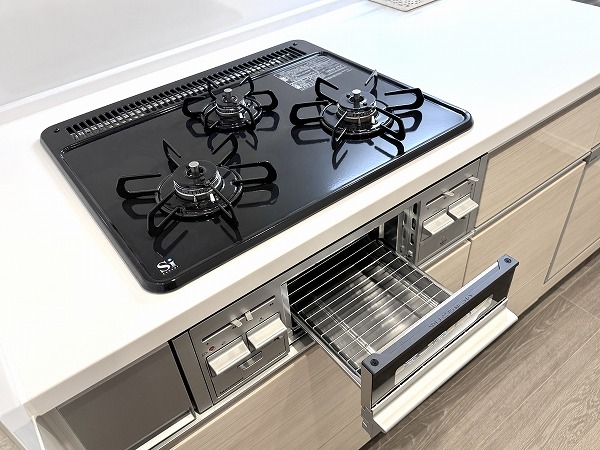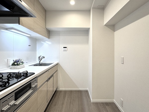 袖壁で区切られた半独立型キッチンは、ご家族との時間を大切にしたい方にぴったり。料理をしながらリビングで過ごすお子様の様子を見守ることができ、声を掛け合いながら家事が進みます。完全に閉じない設計だからこそ、ご家族の気配が自然とつながる安心感がありますね♩