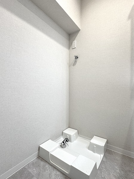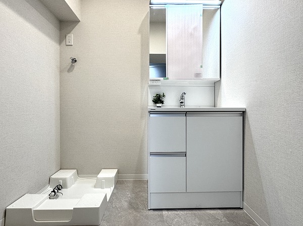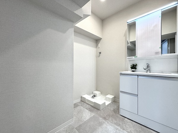 パウダールームは無駄を削ぎ落としたシンプルなホワイトデザイン。清潔感があり、毎日の身支度も気持ちよく行えます。洗面化粧台の横には洗濯機置場を配置し、家事動線にも配慮されていました!