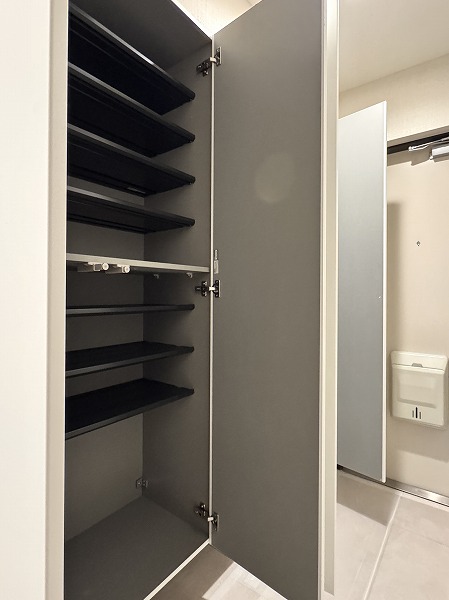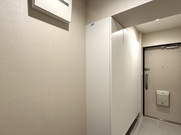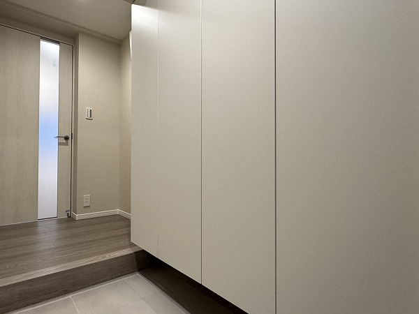 玄関には2つ並んだシューズボックスを備え、靴や小物をしっかり収納できます。壁面にはお気に入りのアートやウェルカムボードを飾ることもでき、来客時にもセンスの良さを演出できる空間です。