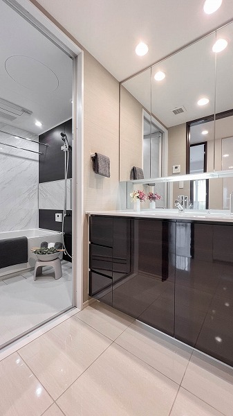 パウダールームには、3面鏡タイプの洗面化粧台を設置。全体を映す鏡に加え、ミドルミラーが備わっているため、手元やメイクの細かい作業も見やすく快適です。カウンターや収納スペースも十分に確保されており、スキンケア用品や日用品をすっきり整理可能。