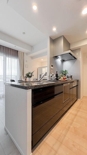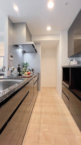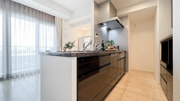 キッチンは約3.1帖の扱いやすいサイズ感で、空間を引き締めるスタイリッシュなモノトーンカラーが印象的。背面にはカップボードが備わり、食器や家電をスマートに収納できるため、ワークスペースをすっきりキープできます。ディスポーザーや食洗機など、日々の家事を軽減してくれる設備も充実◎