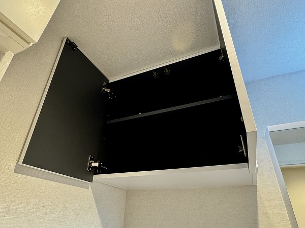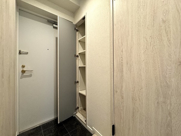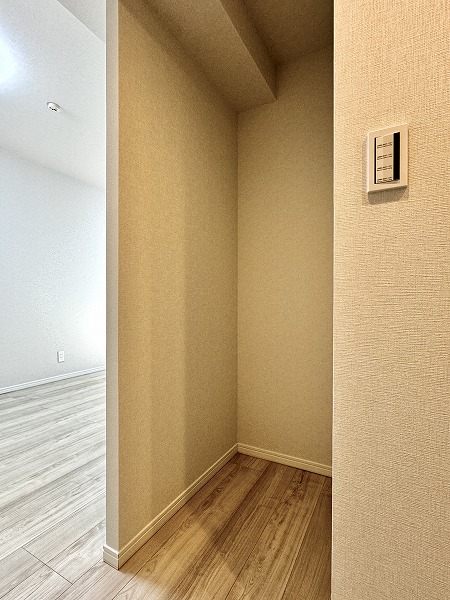メインルームの入口には可愛らしいニッチスペースを発見。鍵やアクセサリーを置いたり、写真を飾ったりと楽しみ方はいろいろ。下段のキャビネットには印鑑などの大切なものを収納できます。モニター付きインターホンも完備で安心感も◎