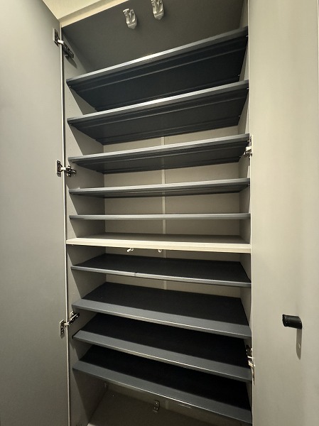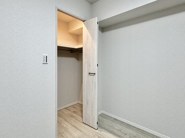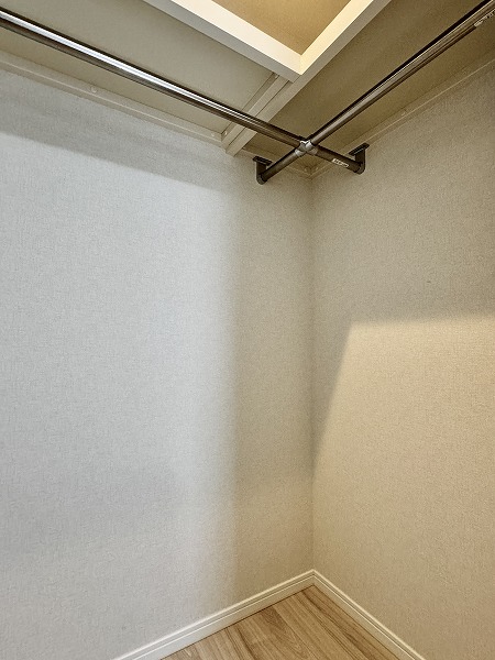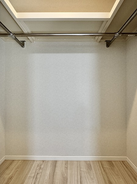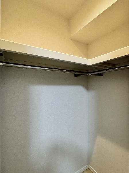 3面にハンガーパイプを備えた大容量クローゼット。奥行きが深く、コート類から大型の荷物までしっかり収納できます。上部の棚は、使用頻度の低いアイテムを整理するのに最適です。
