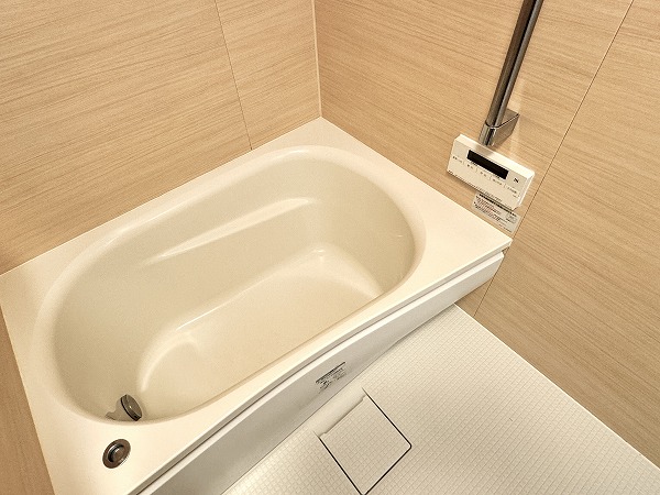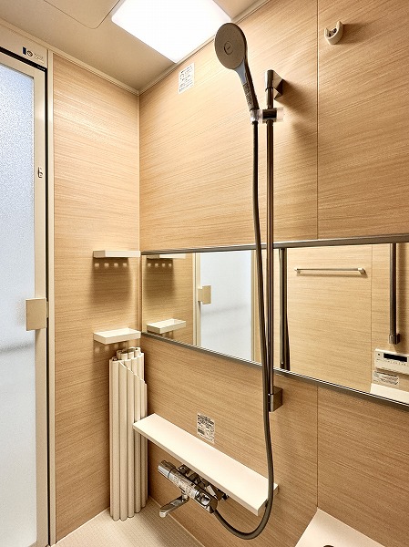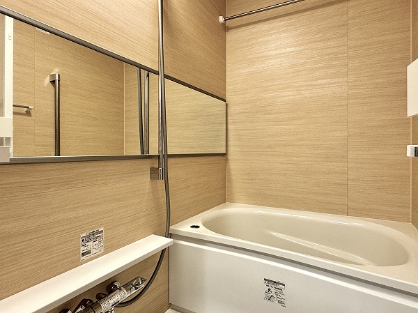 やわらかなベージュトーンでまとめられたバスルームは、落ち着きのある癒し空間。大きなミラーが奥行きを感じさせ、開放的な印象を与えます。追い焚き機能付きで、いつでもあたたかいお風呂に入れるのが嬉しいポイント♡