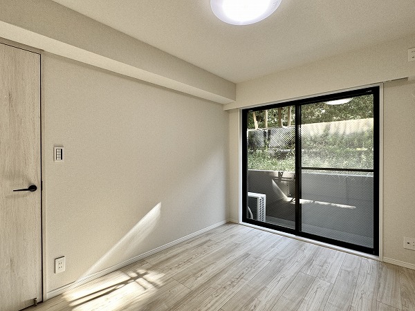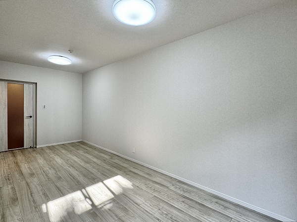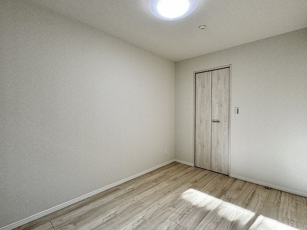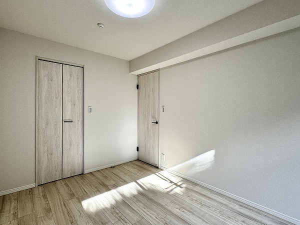 約5.5帖の洋室は、明るい東向きの掃き出し窓が印象的。朝の光を感じながら目覚めるベッドルームにぴったりです♪たっぷり収納できるクローゼットを備え、空間を無駄なく使えますよ。